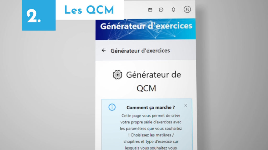 La plateforme est capable de générer à la demande des QCM par notion et/ou par niveau.